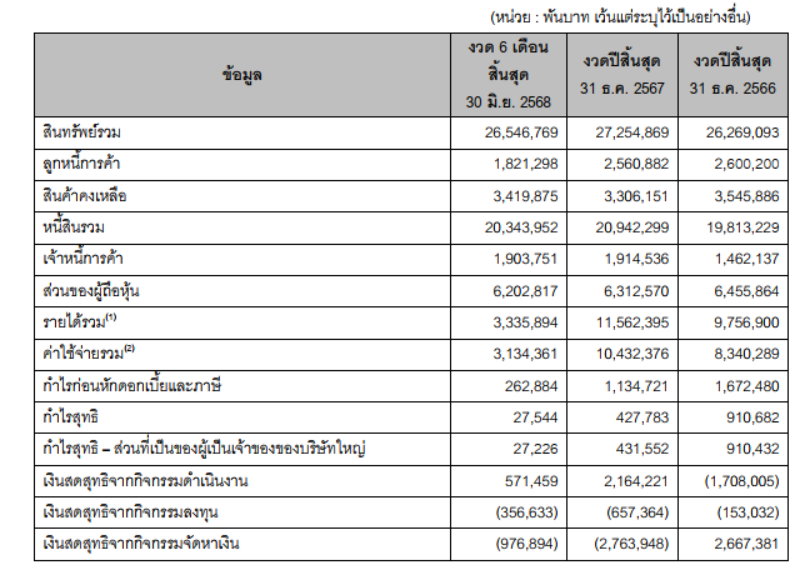 กำไรสุทธิสำหรับปี: กำไรสุทธิสำหรับ 6 เดือน ปี 2568 เหลือ 28 ล้านบาท แสดงถึงความสามารถในการทำกำไรสุทธิที่ อ่อนแอลงอย่างมาก