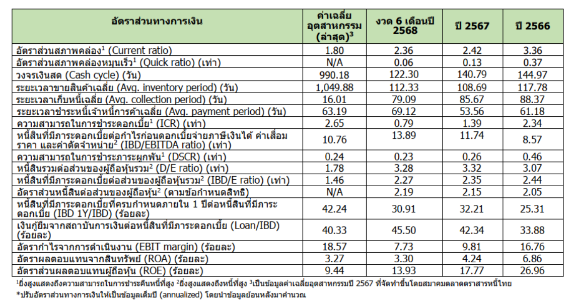 กำไรก่อนหักดอกเบี้ยและภาษี (EBIT): ลดลงอย่างมาก ใน 6 เดือน ปี 2568 เหลือเพียง 263 ล้านบาท เมื่อเทียบกับทั้งปี 2567 (1,135 ล้านบาท) และปี 2566 (1,672 ล้านบาท) การลดลงอย่างมากของ EBIT นี้เป็นสาเหตุหลักที่ทำให้ ICR ลดลงต่ำกว่า 1