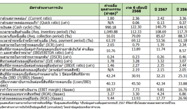 การวิเคราะห์อัตราส่วนทางการเงินพิจารณาจากข้อมูลย้อนหลัง (ปี 2566, 2567 และ 6 เดือน ปี 2568) โดยเปรียบเทียบกับค่าเฉลี่ยอุตสาหกรรม (ปี 2567)