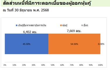 หนี้สินรวม อยู่ในระดับสูง (20,344 ล้านบาท ณ 6 เดือน 2568) และสูงกว่าส่วนของผู้ถือหุ้นมาก (6,203 ล้านบาท) ซึ่งสอดคล้องกับค่า D/E Ratio ที่สูง